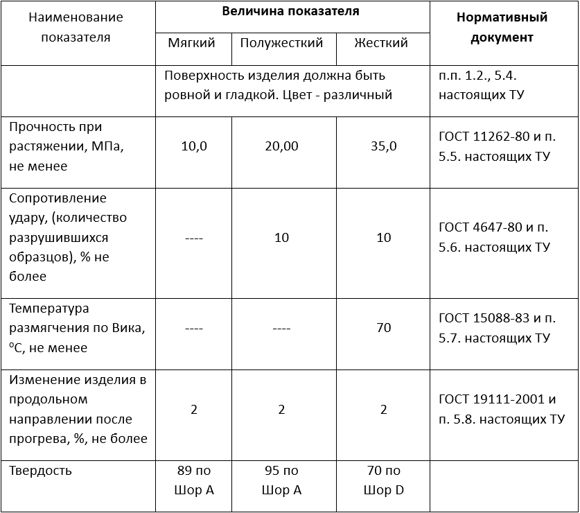 | Температура размягчения по Вика, оС, не менее | ---- | ---- | 70 | ГОСТ 15088-83 и п. 5.7. настоящих ТУ |