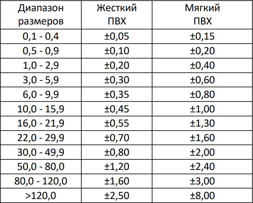 | Диапазон размеров | Жесткий ПВХ | Мягкий ПВХ |