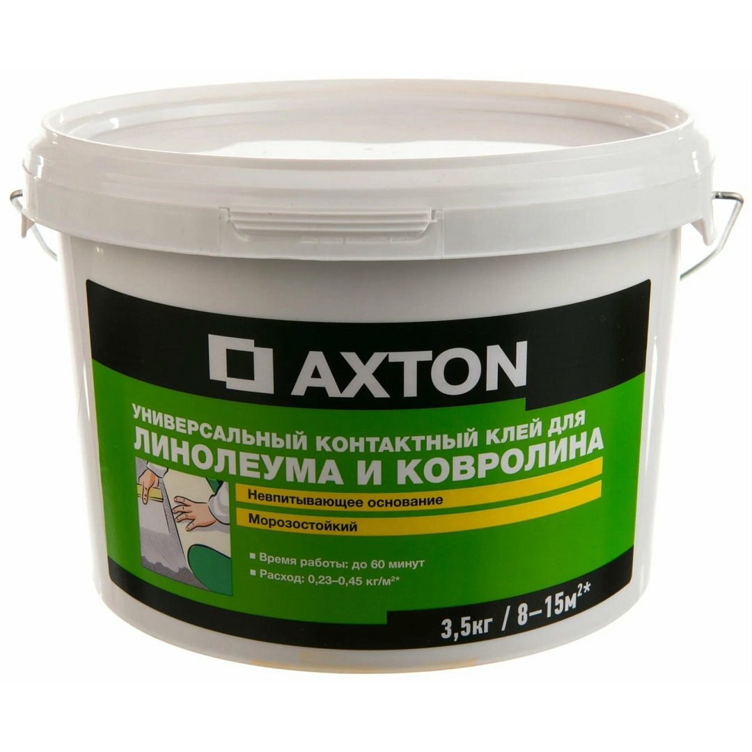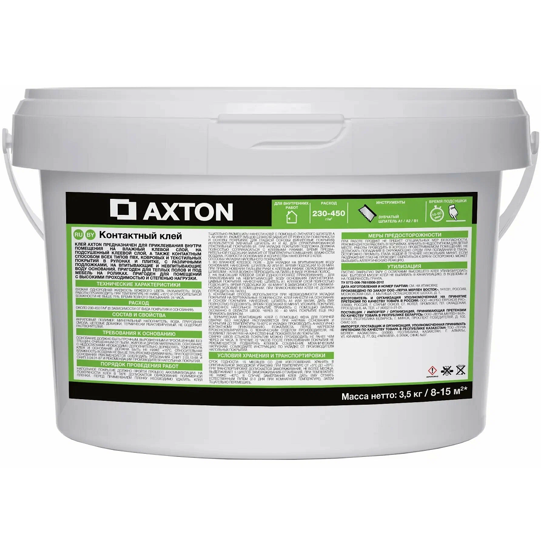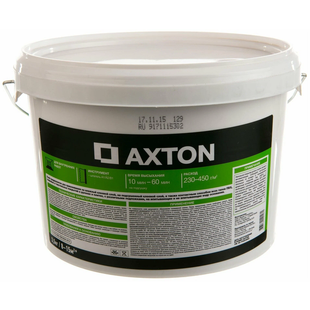Клей контактный Axton - предназначен для укладки гибких напольных покрытий из ПВХ (ПВХ-плитка, Линолеум), а также ковровых покрытий. Клей контактный особенно рекомендуется применять для коммерческих видов линолеума и для помещений с высокой нагрузкой на напольное покрытие. Данный клей обладает высокой начальной липкостью, благодаря которой хорошо удерживает загибы и неровности покрытия. Контактный клей можно применять для впитывающих и не впитывающих оснований. Страна производства — Россия.