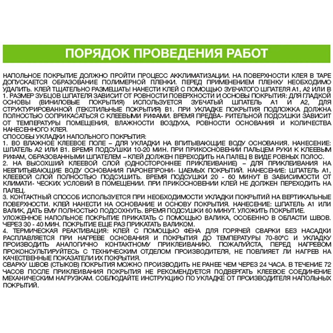 Вещество наносится на подложку напольной отделки, и непосредственно на само основание посредством использования зубчатого шпателя. Перед использованием, его необходимо тщательно размешать.