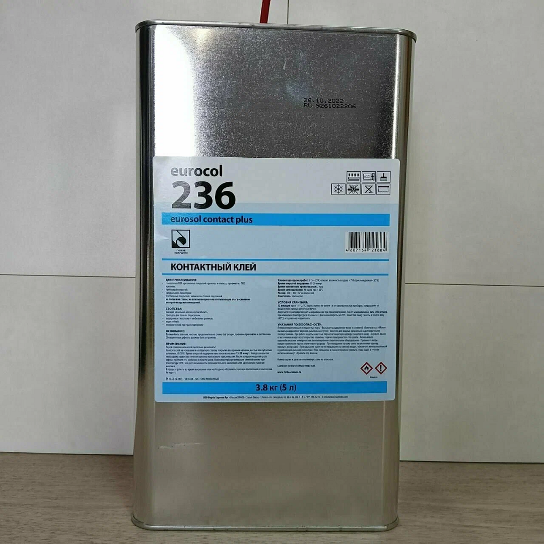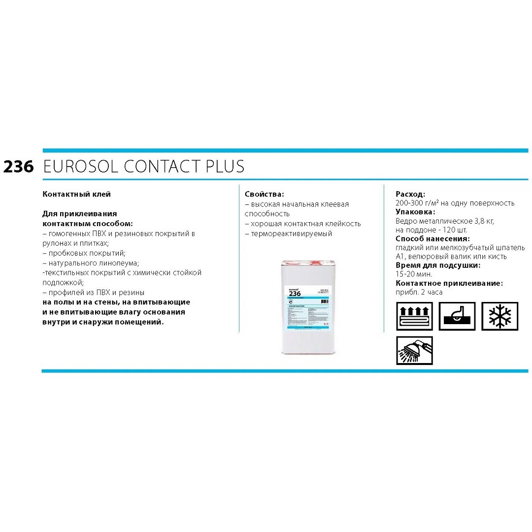 Forbo 236 EUROSOL CONTACT PLUS – клей для приклеивания контактным способом гомогенных ПВХ и резиновых покрытий в рулонах и плитках; пробковых покрытий; натурального линолеума; текстильных покрытий с химически стойкой подложкой; профилей из ПВХ и резины на полы и на стены, на впитывающие и не впитывающие влагу основания внутри и снаружи помещений.