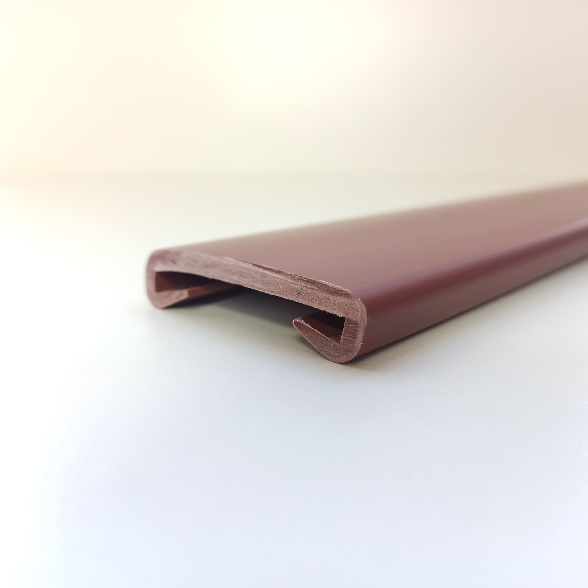 Накладка может быть окрашена в любой цвет RAL CLASSIC для оптовых заказов от 420м. Изготовлена из первичных гранул ПВХ. Поставляется в размерах 30мм - ширина и 5мм - высота. Может быть установлена на прямые или криволинейные перила после нагрева строительным феном. Не требует использования дополнительных деталей. Подходит для ремонта и оформления общих зон, устойчива к частому мытью с любыми дезинфицирующими средствами. Поставляется в бухтах по 21м.